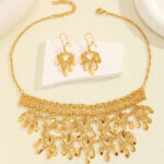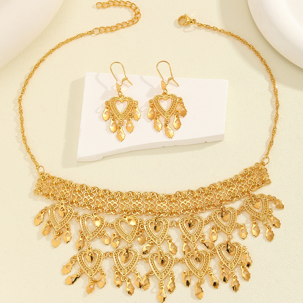 The main body is composed of multiple layers of heart-shaped and hollow patterns, with multiple hanging heart-shaped and small leaf shaped gold ornaments decorated below, creating a complex and exquisite overall design. The matching earrings also feature a heart shape as the main element, paired with a small pendant to complement the necklace style. Commonly worn in important occasions or as a precious gift.